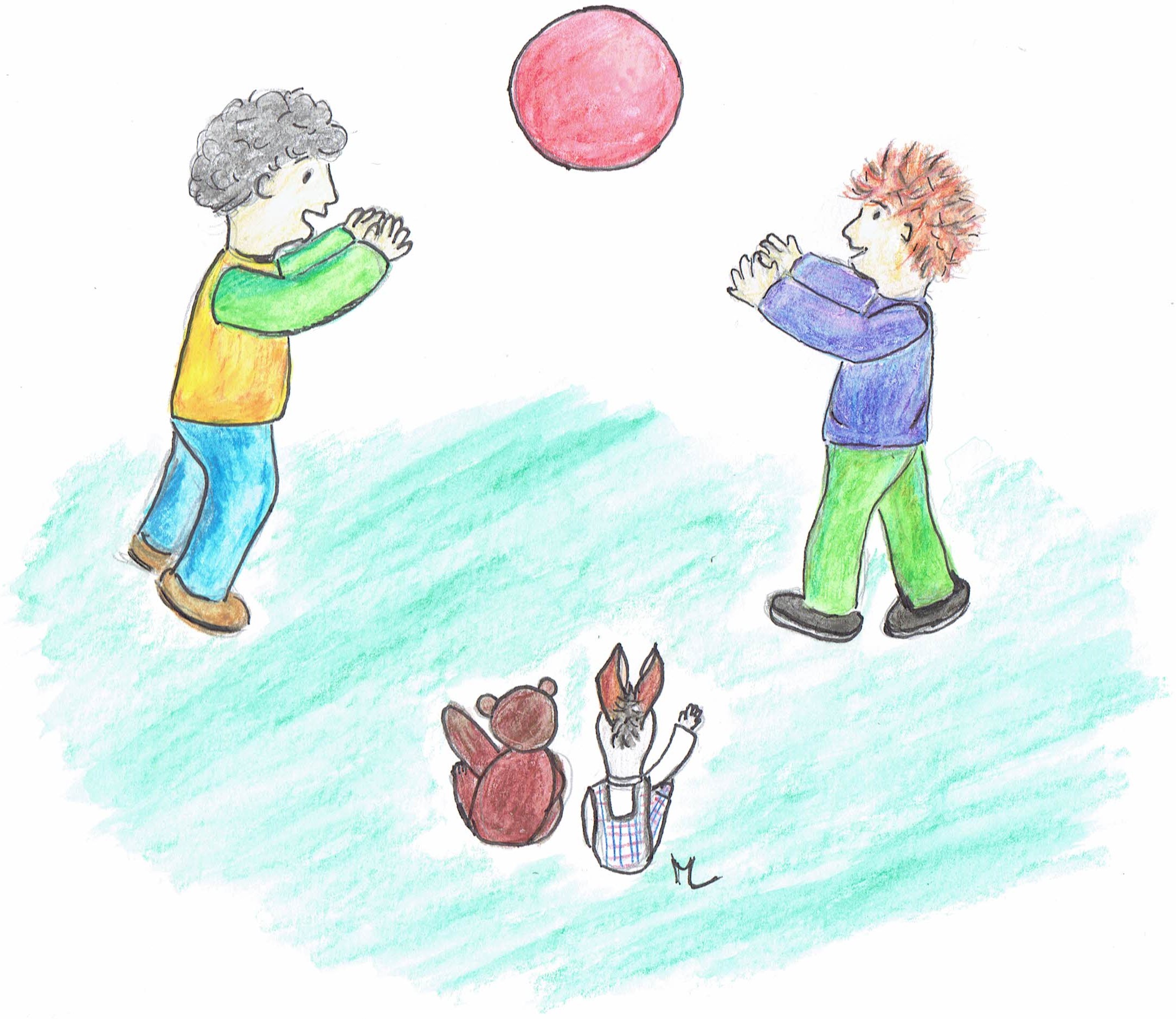 Doch Esellotti und Malli wurden schon bald müde und setzten sich ins Gras. Sie sahen zu, wie Timmi und Kai mit dem glänzend roten Ball spielten.
